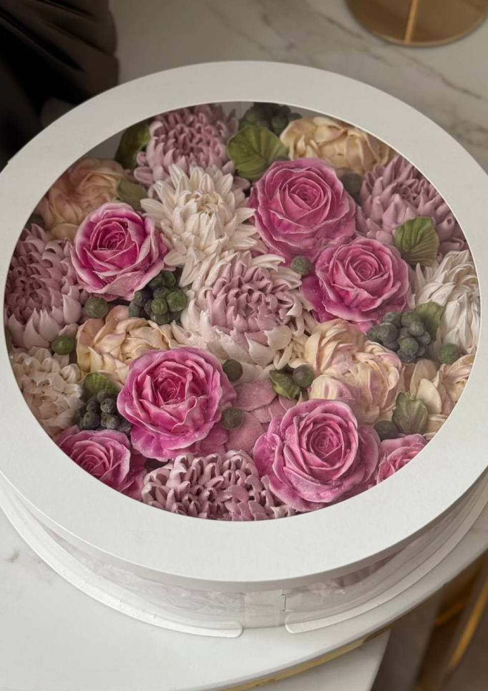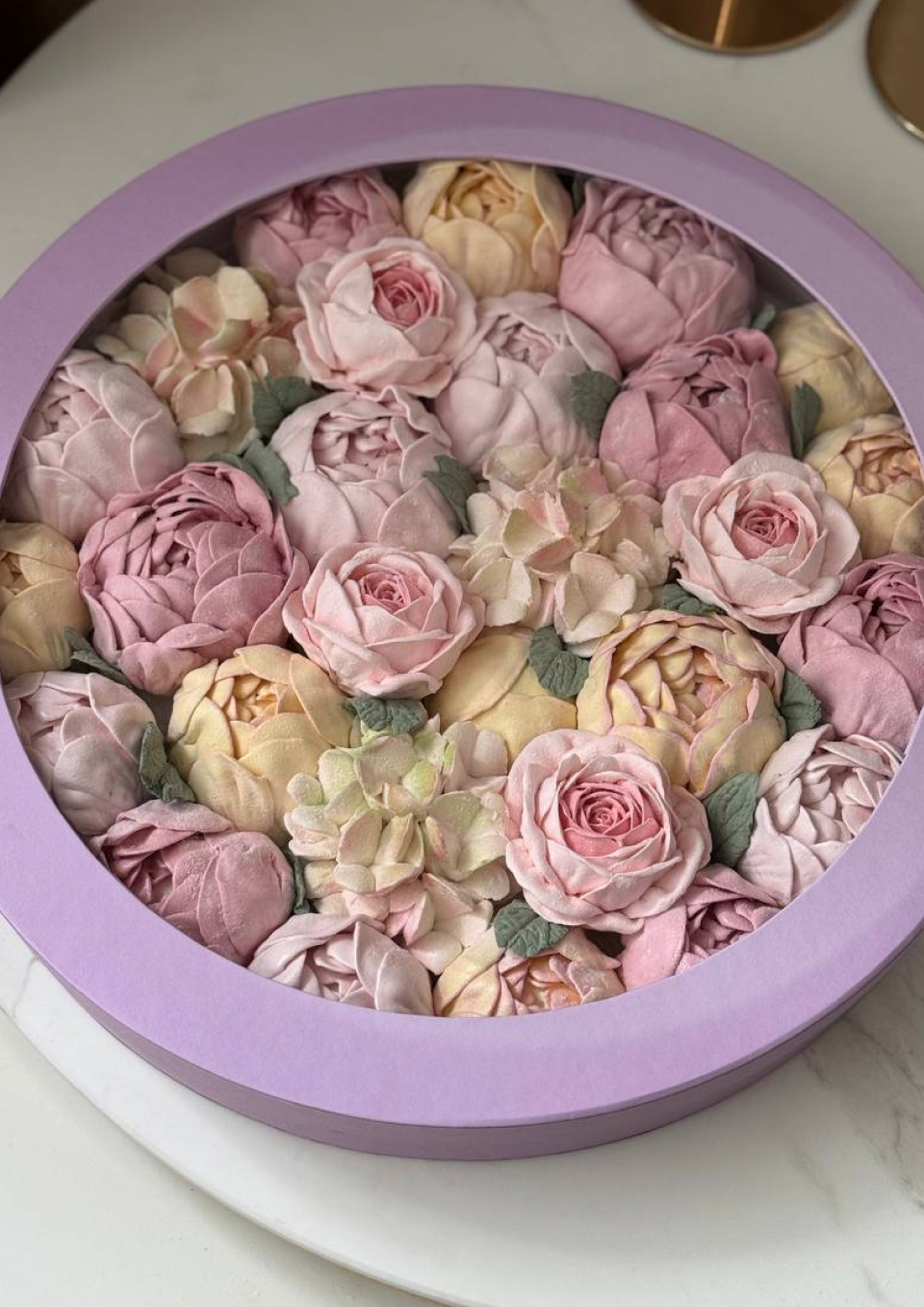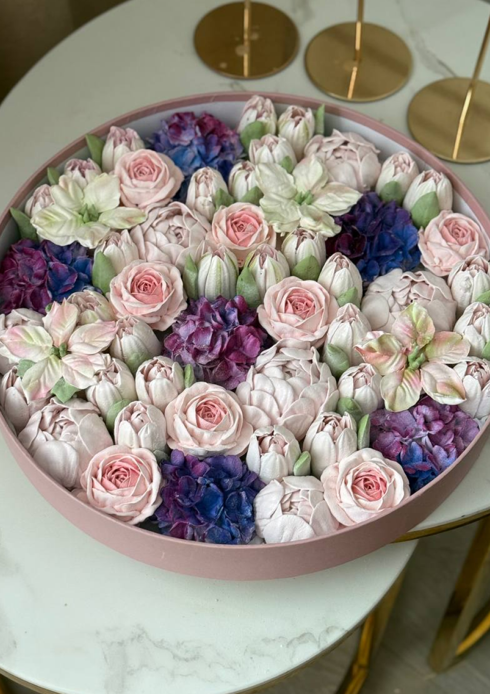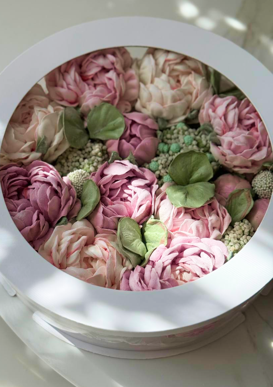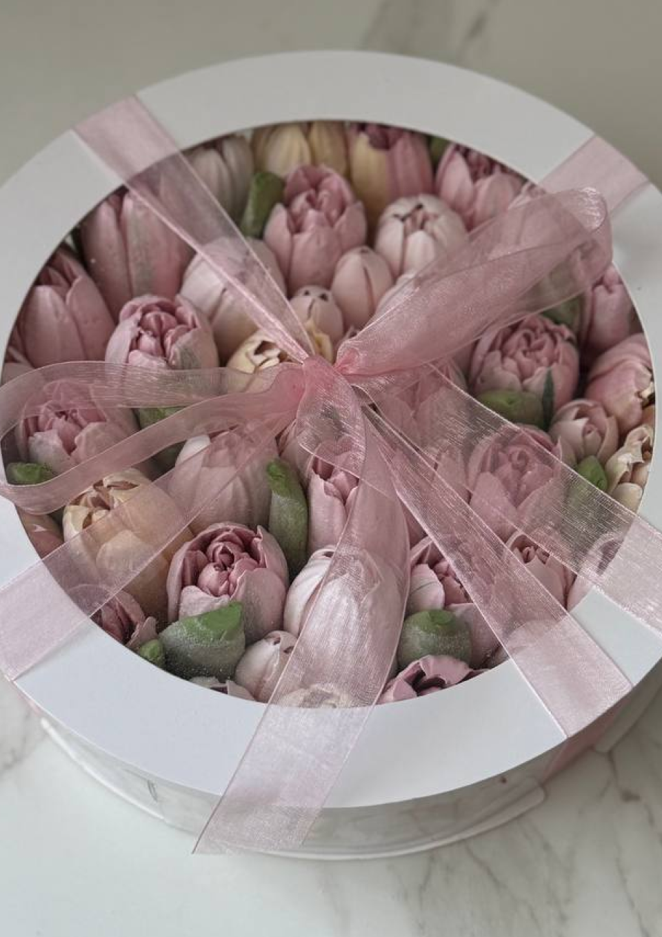 Подаруйте солодку радість з нашими ніжними композиціями в круглих коробках із зефірних квітів!